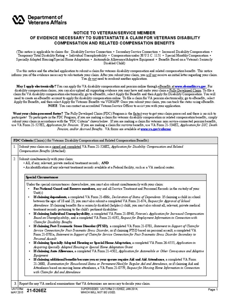 Va form 21 526ez compensation claim. For pension claims use the Pension Management Center PMC that serves your state. VA Form 21-526EZ- Application for Disability Compensation Benefits Veterans and Service Member should use this form to submit a claim for veterans disability compensation and related compensation benefits. For dual pension and compensation claims use the mailing address below for compensation claims. Go to any VA medical exams required for us to decide your claim.